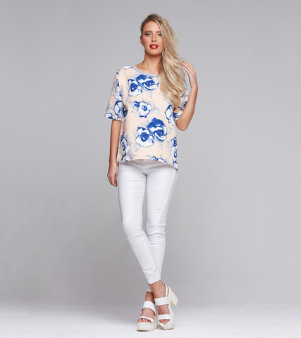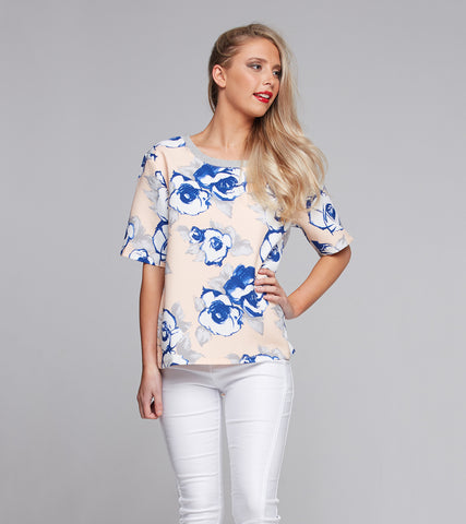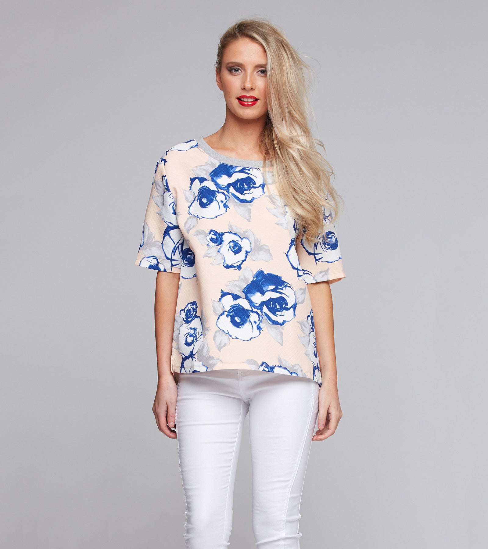 Loose fit, Round ribbed neck-line, Jacquard pattern, Floral print. Model wears size 8. Material: Polyester.