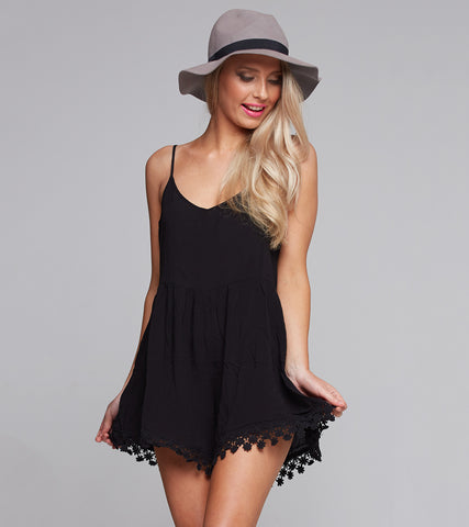 Relaxed fit, V neckline, Thin shoulder straps, Invisible zip on back, Floral lace detail trim on the hemline. Model wears size 8. Material: Rayon.