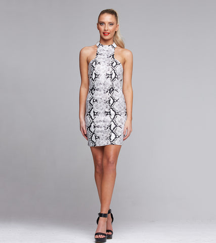 Zip closure down center back, High neck-line, Snake skin inspired print. Model wears size 8. Material: Polyester.