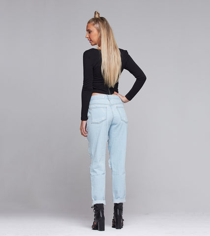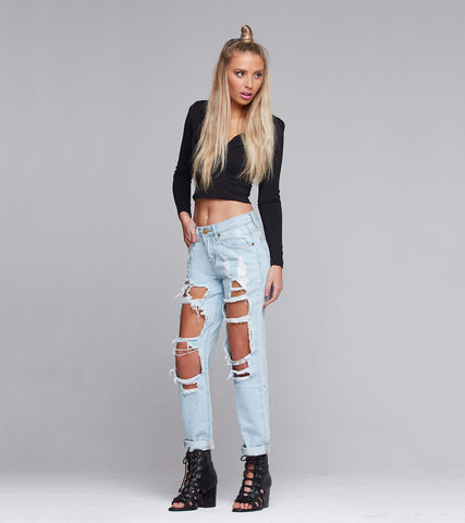 Ripped detailing, Super comfy denim, Button & zip closure. Model wears size 8. Material: Denim.
